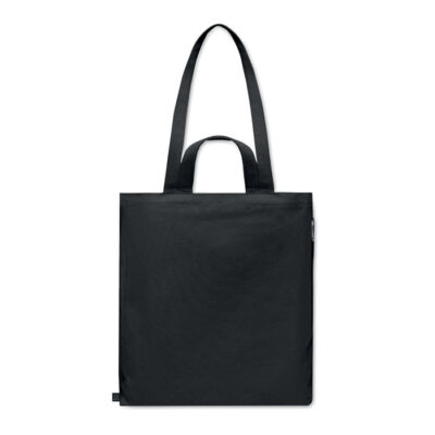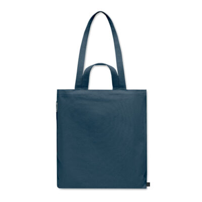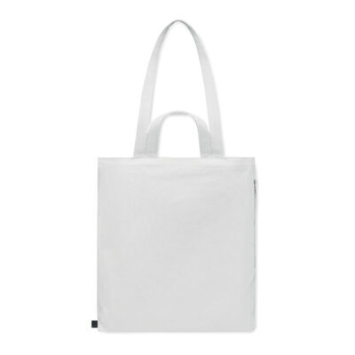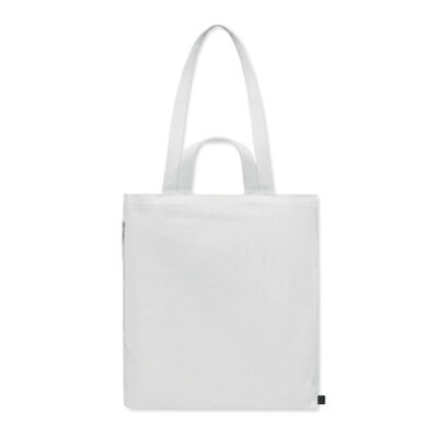 Recycled polycotton shopping or beach bag (70% recycled cotton, 30% recycled polyester) with short and long handles. It has a side zippered pocket. 380 gr/m².
