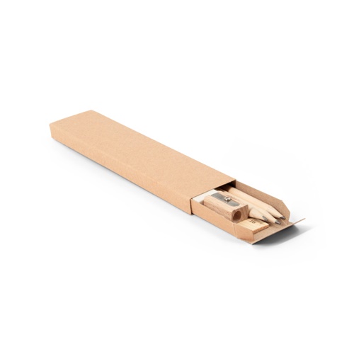 Versatile writing set consisting of 3 sharpened pencils with a round shape and HB hardness, 1 pencil sharpener in natural wood, 1 eraser in TPR and 1 165 cm ruler in pine wood with a scale in centimetres (cm). Supplied in a kraft paper gift box. As the product is made from natural materials, the colour and the printing result may vary between products. 175 x 43 x 14 mm