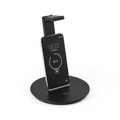 ABS headphone stand with built-in wireless charger. 10W power. USB-C input with 5V/2A or 9V/11A and wireless output with 5V/1A or 9V/11A. USB-C cable to charge. Supplied in a gift box. ø160 x 257 mm | Box: 175 x 47 x 344 mm