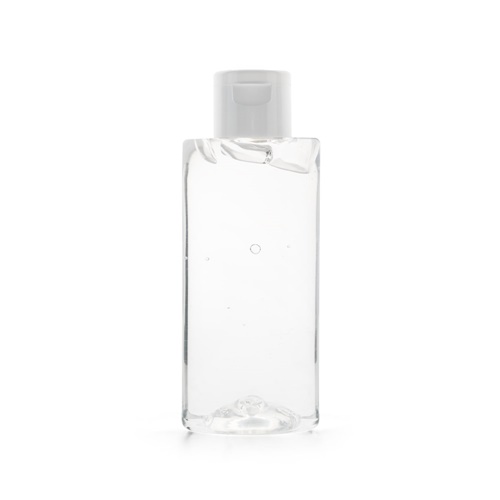 Sanitising gel in a 50 mL PET bottle with flip top cap. It is a cosmetic product. Practical to take and use anywhere. ø40 x 97 mm
