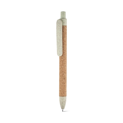 Cork ball pen with clip and coloured trim in wheat straw fibre and PP. Blue ink. ø11 x 140 mm