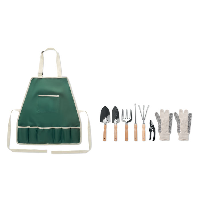 Set of 7 garden tools presented in apron. 1 pair Garden Gloves, 2 forks, 1 scissors, 1 weeder and 2 trowels.