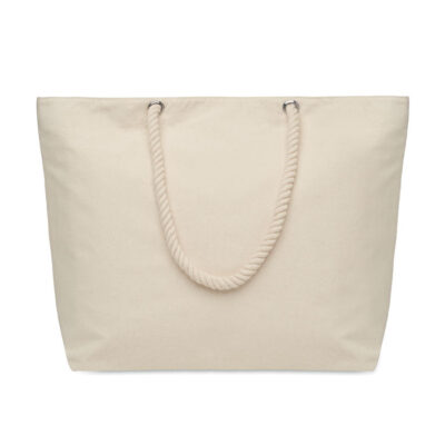 Zippered beach cooler bag in cotton with cord handle. 220 gr/m². 2mm aluminium foil insulation.