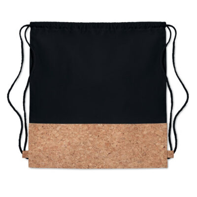 Twill cotton drawstring bag with a cork detail. 160 gr/m². Cork is a natural material, due to its structural nature and surface porosity the final print result per item may have deviations.