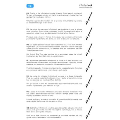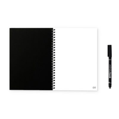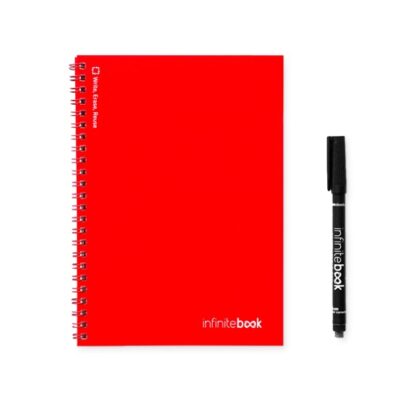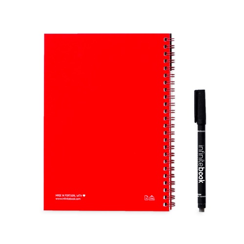 “A5 notebook – “”Infinitebook”” – with flexible cover and matching colour rings. Contains 15 whiteboard-style plain pages and a black marker. This notepad enables easy writing and erasing and is a practical solution for minimising paper consumption. Made in Europe. Supplied in a kraft paper envelope with a sticker. 148 x 210 mm”