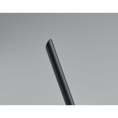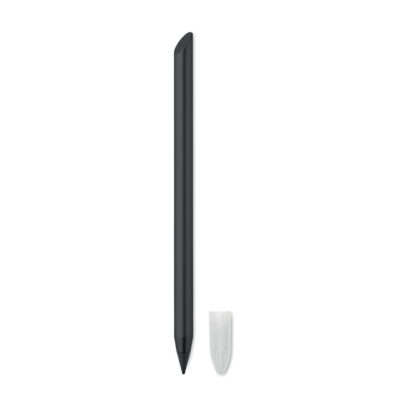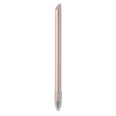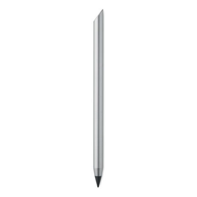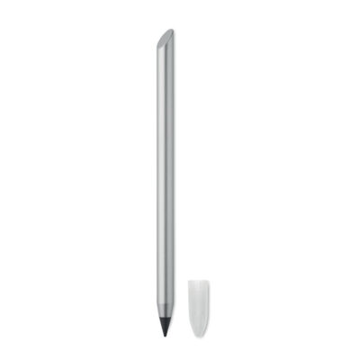 Long lasting recycled aluminum inkless pen. The pen writes with the metal alloy tip that has a plastic protection cover.