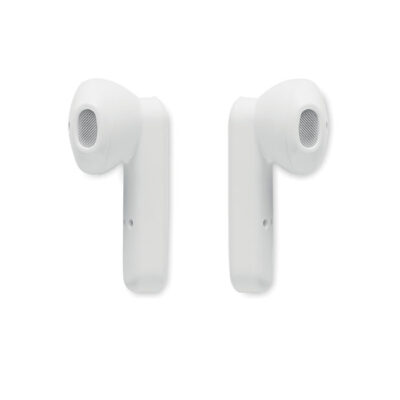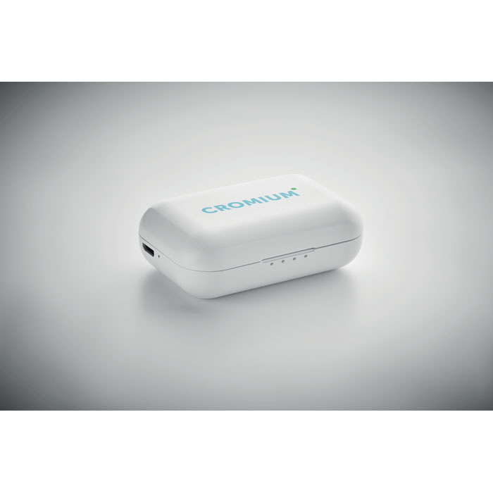 Set of 2 True Wireless Stereo (TWS) 5.0 earbuds with 30 mAh battery built-in. Playing time approx. 3 hours. Including a micro USB charging cable and a 185 mAh charging station.