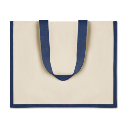 Jute shopping bag laminated with front in canvas and cotton webbing. Long handles.