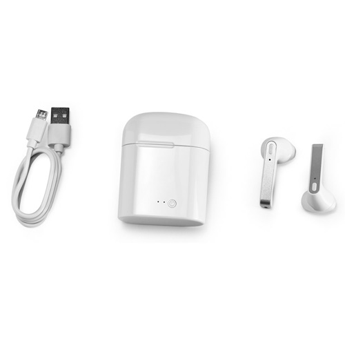 “ABS wireless stereo earphones. BT transmission, with autonomy of up to 6 hours. Functions: answering calls, control volume and connect to the playlist of a mobile device. Includes USB charging cable. Supplied in a box with charger function. 71 x 55 x 28 mm | Headphone: 47 x 21 x 21 mm Promotion valid from 22/10/2024 until 20/12/2024 and limited to existing stock. For more information on the conditions of this promotion, please contact your account manager. “