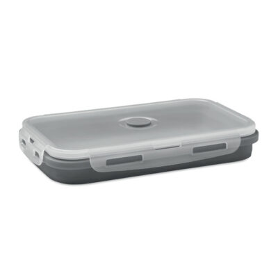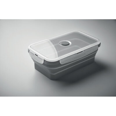 “Collapsible silicone lunch box with PP lid and silicone valve. Capacity: 1200 ml.”