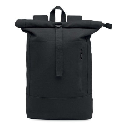 Zippered rolltop 15 inch laptop backpack in recycled pre-consumer cotton and recycled polyester (70%/30%). Front zippered pocket. Padded back and shoulder straps. 340gr/m².