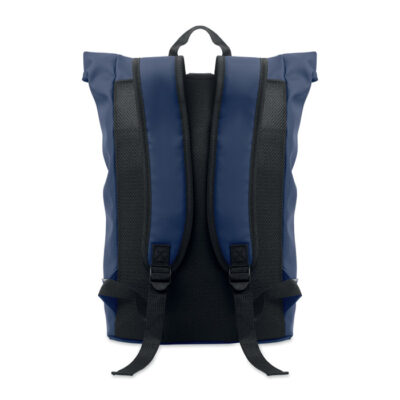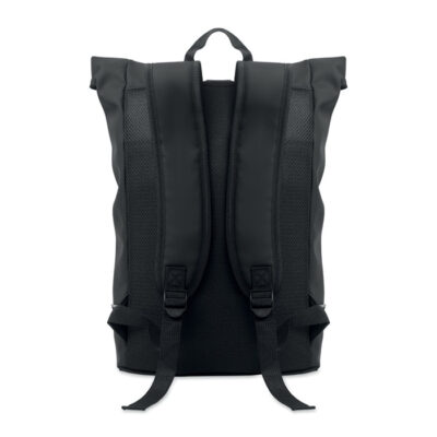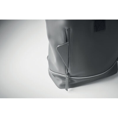15 inch roll top laptop backpack in soft PU with padded back and base reinforcement with reflective strip. Waterproof zippered front pocket. 210D RPET polyester lining.