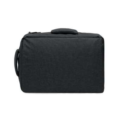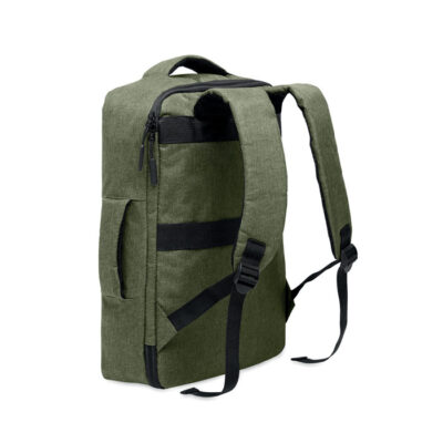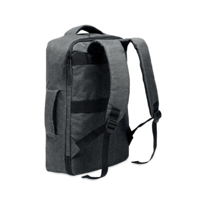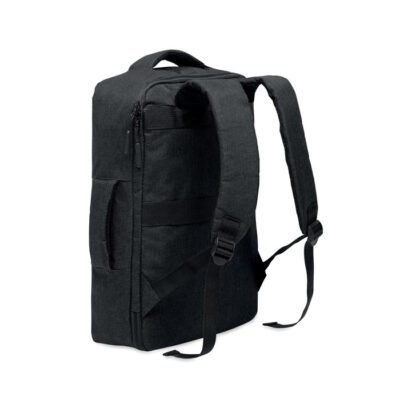 Slim 15 inch laptop backpack in 300D RPET with safe 180 degree opening with 210D RPET lining. Includes laptop compartment, 2 internal slip pockets, 2 internal pen pockets and 2 padded carry handles. Soft padded back and shoulder straps. Suitcase sleeve.