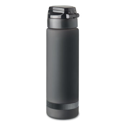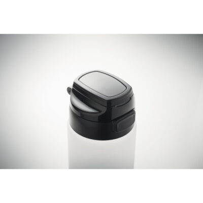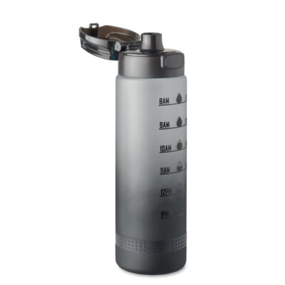 “Sports water bottle in RPET, motivational time markings, one hand opening flip top lid, safety lock and carrying strap. Capacity: 1L.”