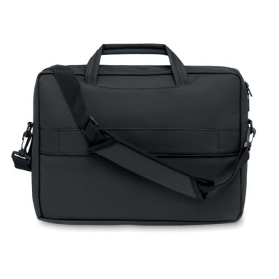 15 inch laptop document bag in soft PU with padded back . One main padded laptop compartment and zippered front pocket with several compartments. 210D RPET polyester lining. 2 handles and one adjustable and detachable shoulder strap with protection and trolley holder on back side.
