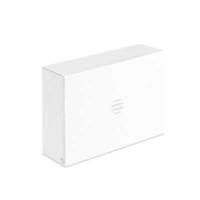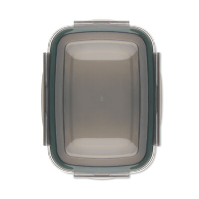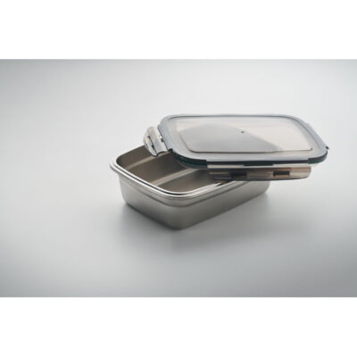 Recycled stainless steel lunch box with recycled PP lid and 4 side clasp closure. Capacity: 850 ml.