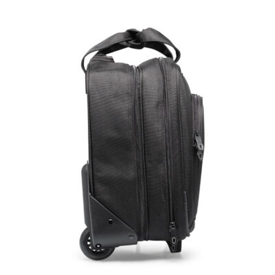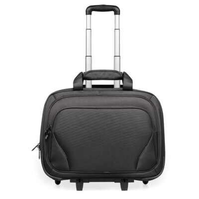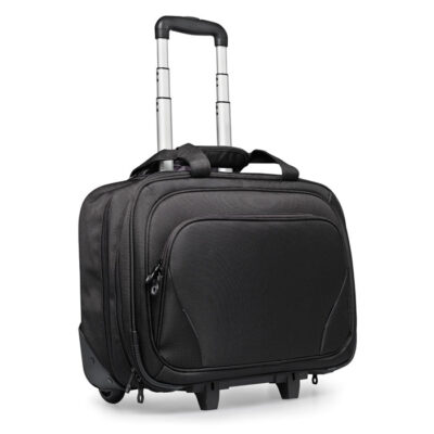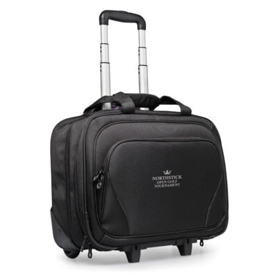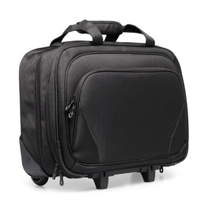Business trolley including a 17 inch laptop pocket and 10 inch tablet pocket with several compartments. 1680D polyester.