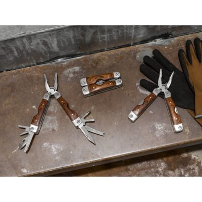 Folding pliers with multi-function tools in stainless steel and wood. Includes 20 functions: pliers, screwdriver, bit and 10x bit adapter, leather awl, bottle opener, ruler, fish scale, hook puller, PH screwdriver, flathead screwdriver, knife and screw. Supplied in polyester bag. 45 x 100 x 25 mm | Pouch: 65 x 140 x 30 mm