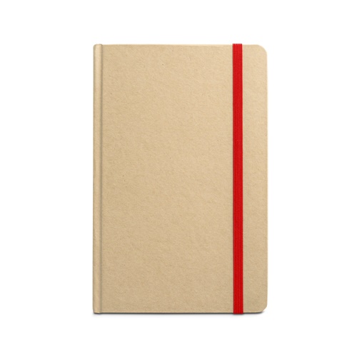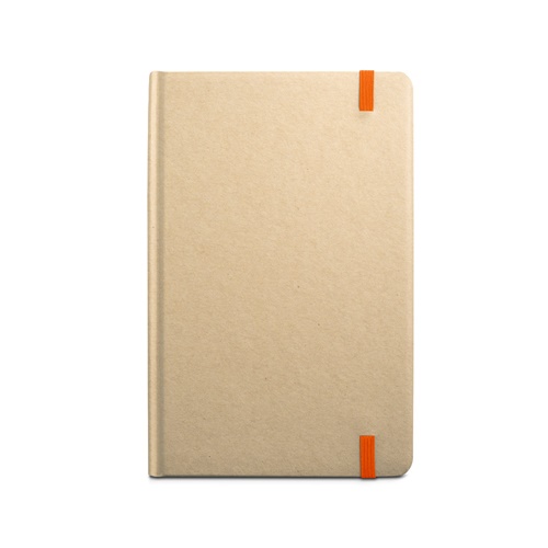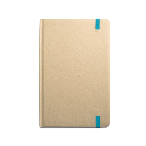 A5 notepad with 160 lined paper pages and hardcover in cardboard. Contains bookmark ribbon and elastic band matching color. 137 x 210 mm