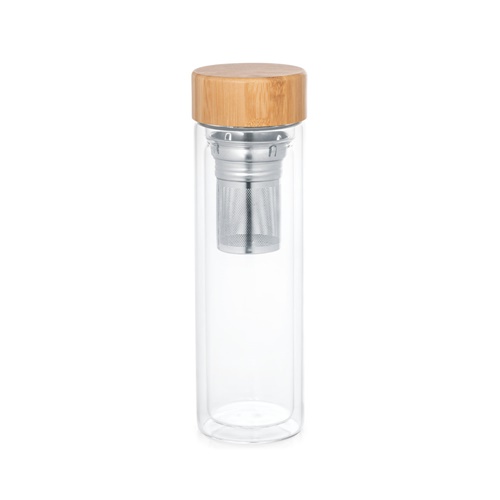 Double-walled borosilicate glass travel cup with bamboo lid. Includes 2 stainless steel infusers. The bottle has a volume-capacity of 490 mL. Suitable for dishwasher, once lid is removed. Supplied in a paper kraft box. As the product is made from natural materials, the colour and the printing result may vary between products. ø72 x 234 mm