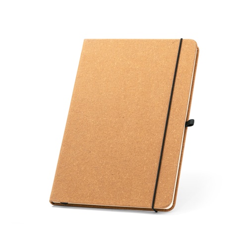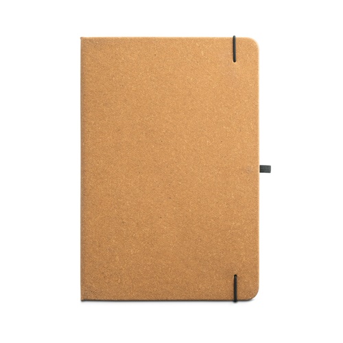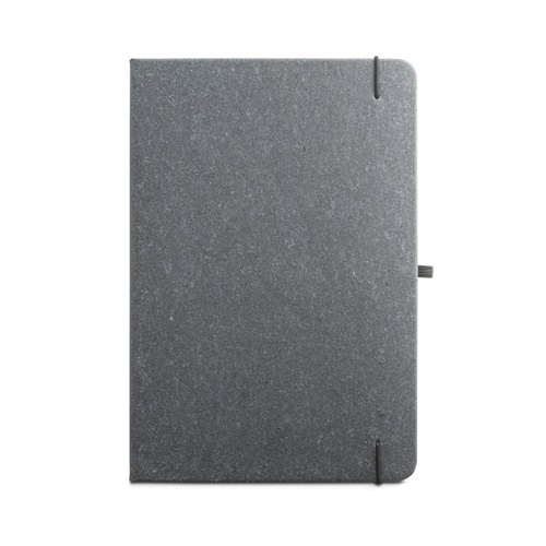 A5 notebook with rigid cover in recycled leather (70%) with 192 lined ivory pages from (70 g/m²) a sustainable forest management. Pen holder (pen not included), black elastic band and bookmark ribbon. Contains interior pocket. Supplied separately with black cardboard envelope. 140 x 210 mm
