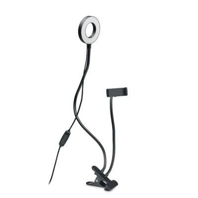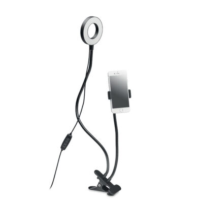 24 cm LED portable selfie ring light with phone holder and clip. Ideal for tik-tok®, live-streaming, broadcasting and photography. White, warm, light with 3 brightness levels.