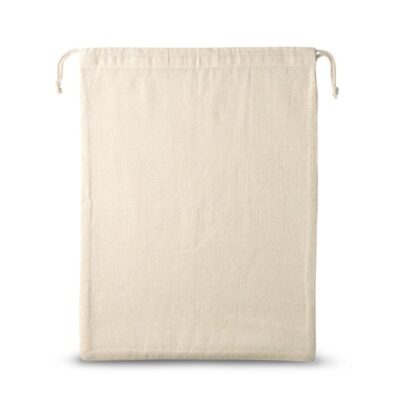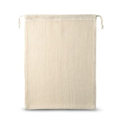 100% cotton bag (120 g/m²) with 100% cotton mesh on the front (100 g/m²). With cotton rope for closure. Ideal to carry food. 300 x 400 mm
