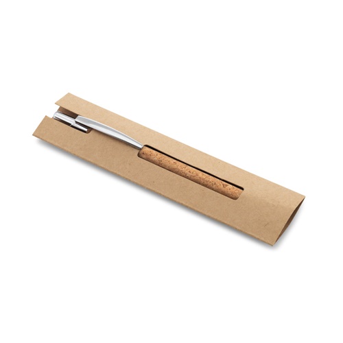 Cork ballpoint with a metal clip. Supplied with a Kraft paper gift pouch. ø9 x 139 mm | Pouch: 155 x 40 mm