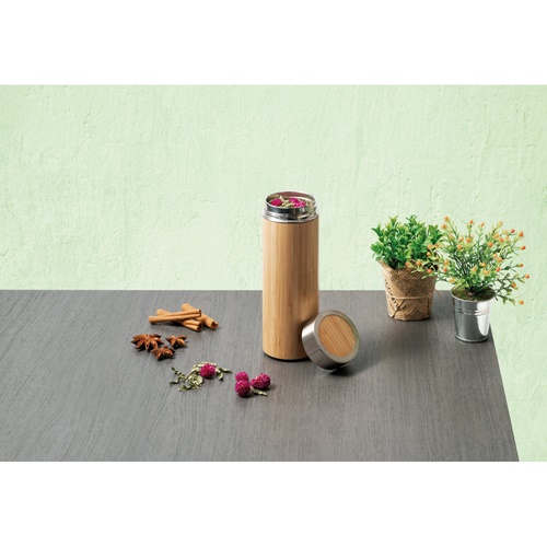 Bamboo and stainless steel (90% recycled) thermal bottle with vacuum double body and tea infuser. This bottle has a capacity up to 430 mL and is supplied in a gift box. As the product is made from natural materials, the colour and the printing result may vary between products. ø69 x 207 mm | Box: 72 x 210 x 72 mm