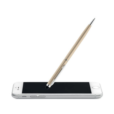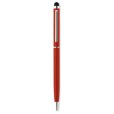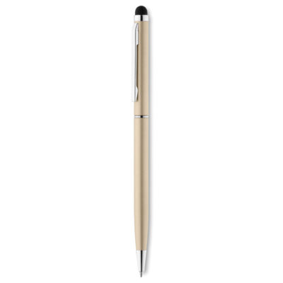 Twist action ball pen in aluminium with stylus and shiny chrome clip. Blue ink.