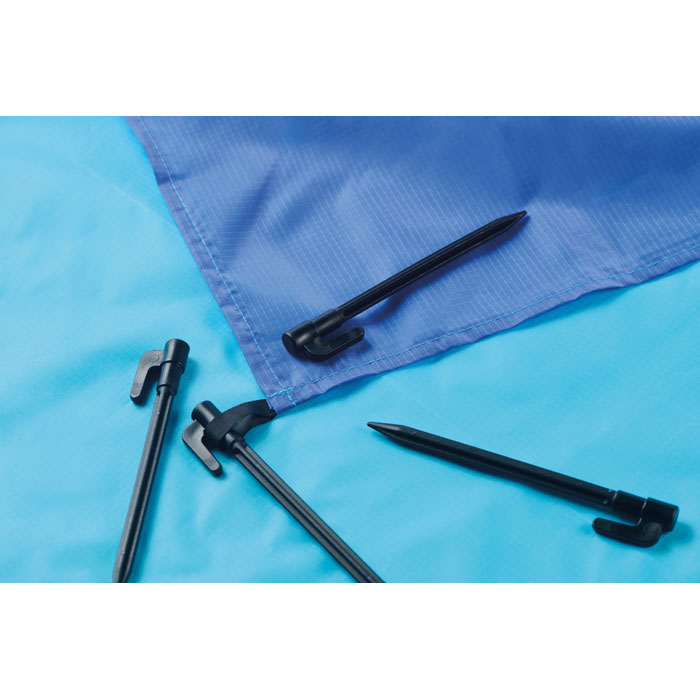 Lightweight beach mat in 210T polyester measuring 200x210cm. Includes 4 black hooks and a matching drawstring pouch for easy carrying.