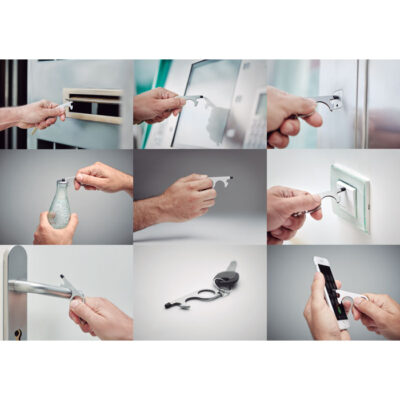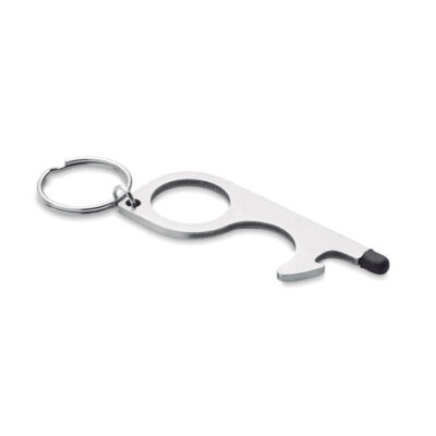 Multifunctional 5-in-1 no touch keyring. Open doors, press buttons of elevators, traffic lights, ATM`s and mobile devices without touching them. Including a bottle opener, stylus and keyring. The easy way to prevent spreading germs.