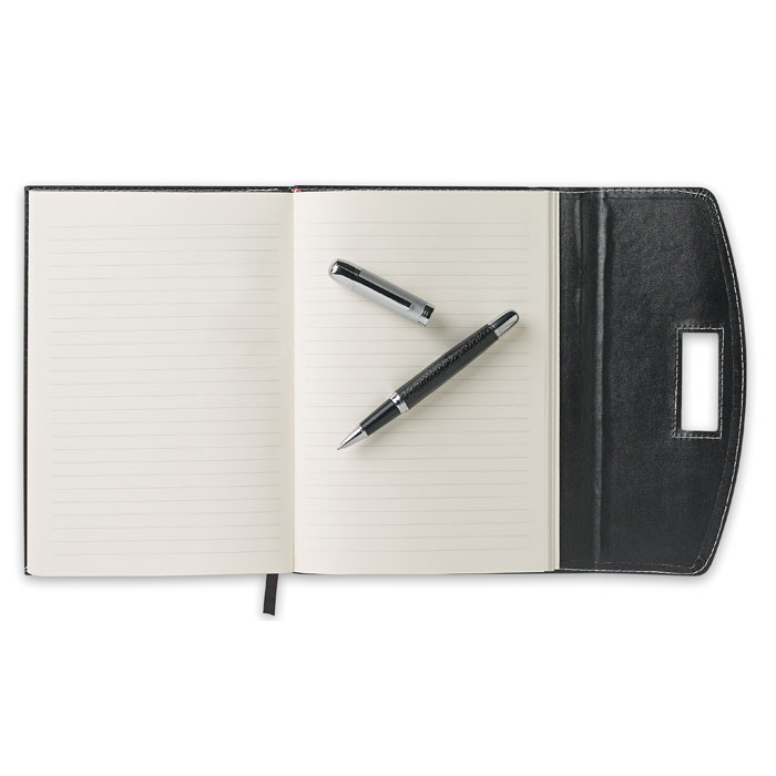 A5 PU notebook portfolio with contrast stiching and pen. 240 lined pages (120 sheets). Matching metal pen. Black ink.