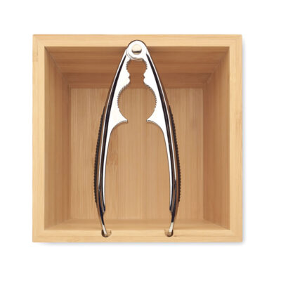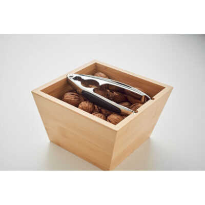 Nut cracker set with bamboo bowl and silver coloured nut cracker in zinc alloy with TPR grip.