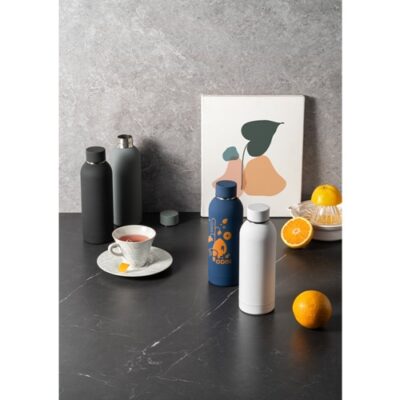 Double wall vacuum stainless steel bottle with rubber coating, screw-on lid and capacity up to 550 mL. Supplied in a gift box. ø70 x 220 mm