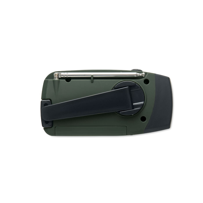 Portable AM/FM radio in ABS with LED Torch (2 settings) and a 1200mAh Power bank for emergency charging. Self powered by solar and hand crank.