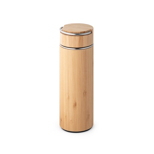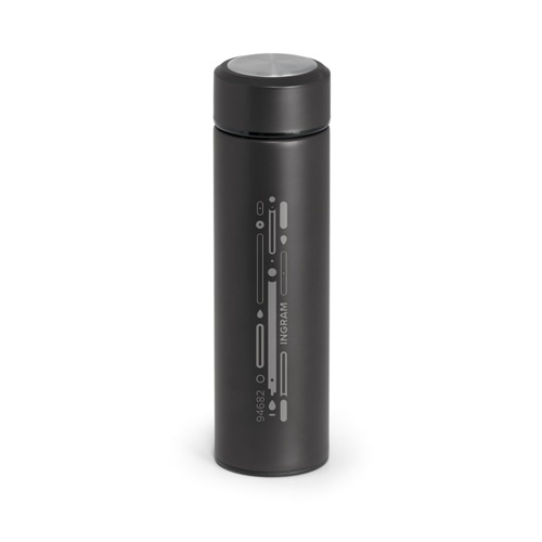 Double wall vacuum insulating bottle in recycled stainless steel (90% recycled stainless steel and 10% stainless steel) with recycled PP double lid opening for easy cleaning. Leak-free. Capacity: 320 ml.”