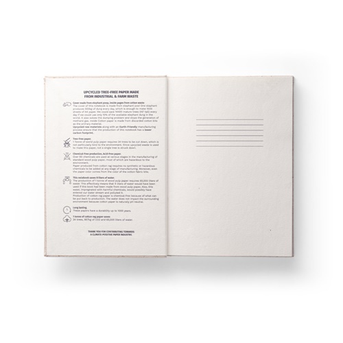 A5 notepad with hard cover made from organic elephant matter (80%) and cotton waste (20%). The inner paper is made from cotton waste (100%) and is highly durable. Contains 120 lined pages and paper band with artwork. No waste was generated and no chemicals or trees were used in the manufacturing process of this notepad. As the product is made from natural materials, the colour and the printing result may vary between products. 140 x 200 mm