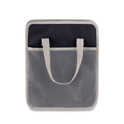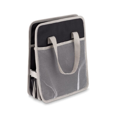 Foldable car organizer in 600D polyester with mesh pocket on side. When not in use, you can fold this up for compact storage. Also, this makes driving safer as it will prevent items from possibly rolling under the drivers feet.