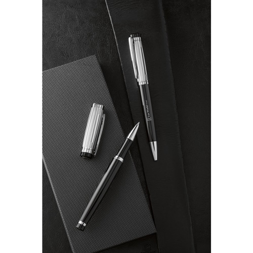 Set with metal ball pen and rollerball with clip. Supplied in a cushioned gift box with magnet closure. Blue ink. Ball pen: ø13 x 136 mm | Roller: ø13 x 135 mm | Box: 192 x 34 x 85 mm
