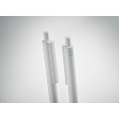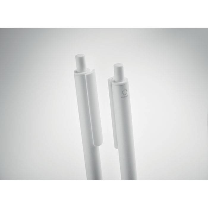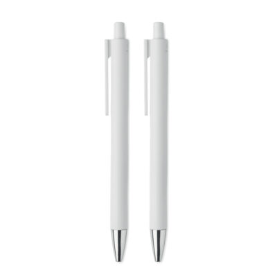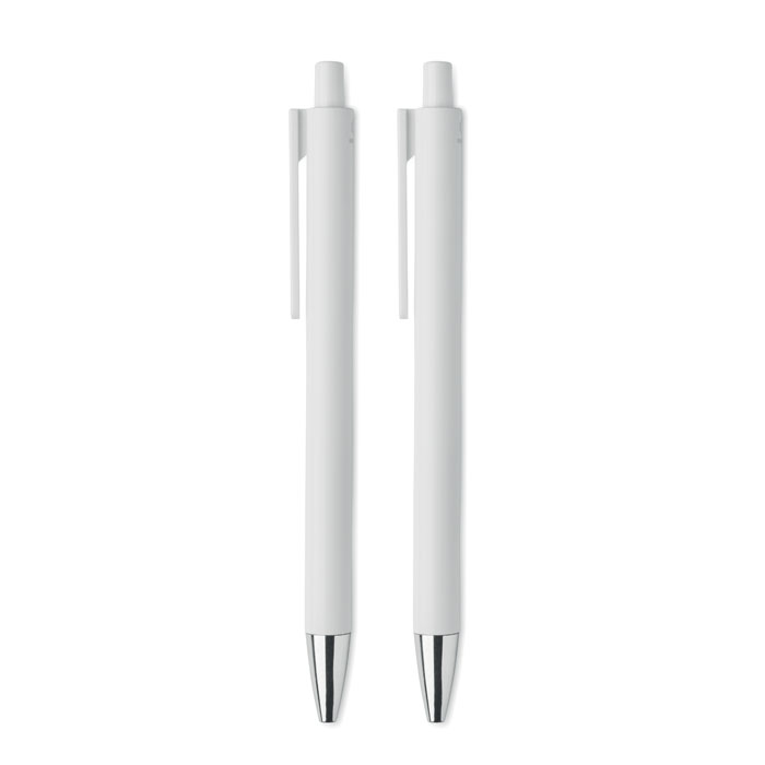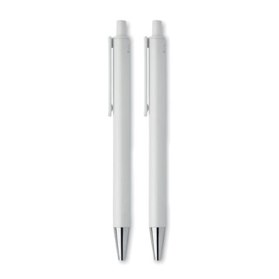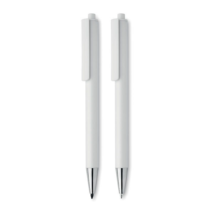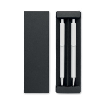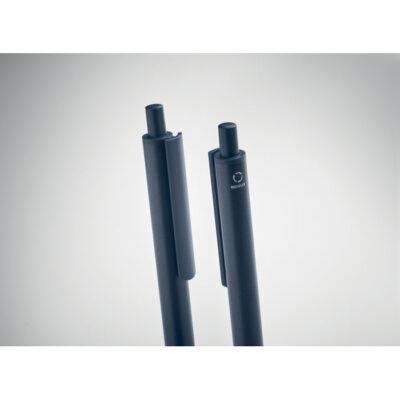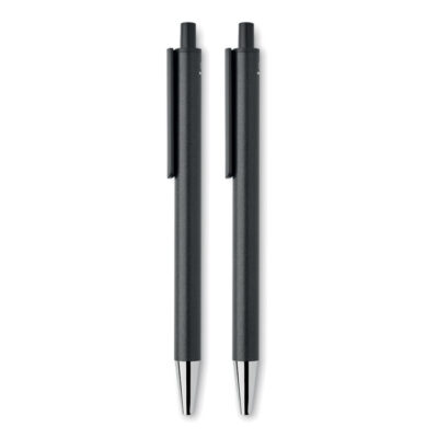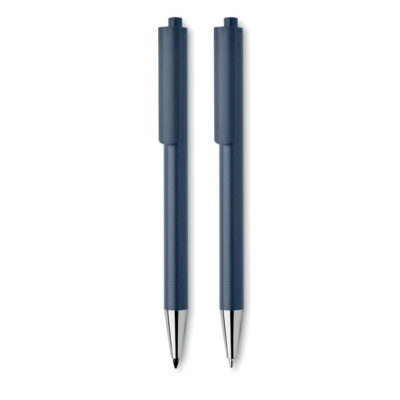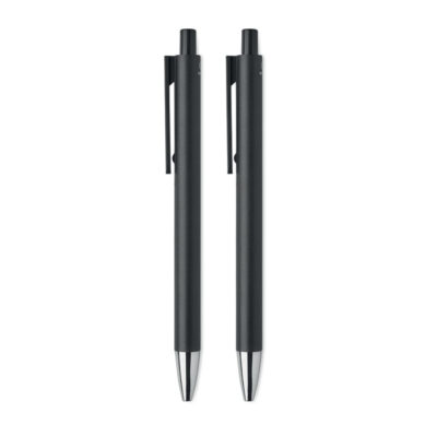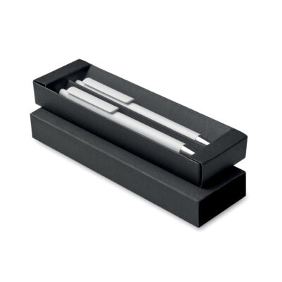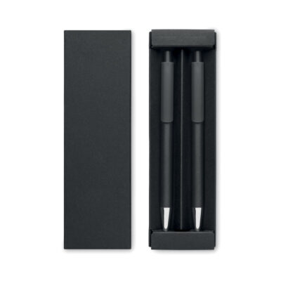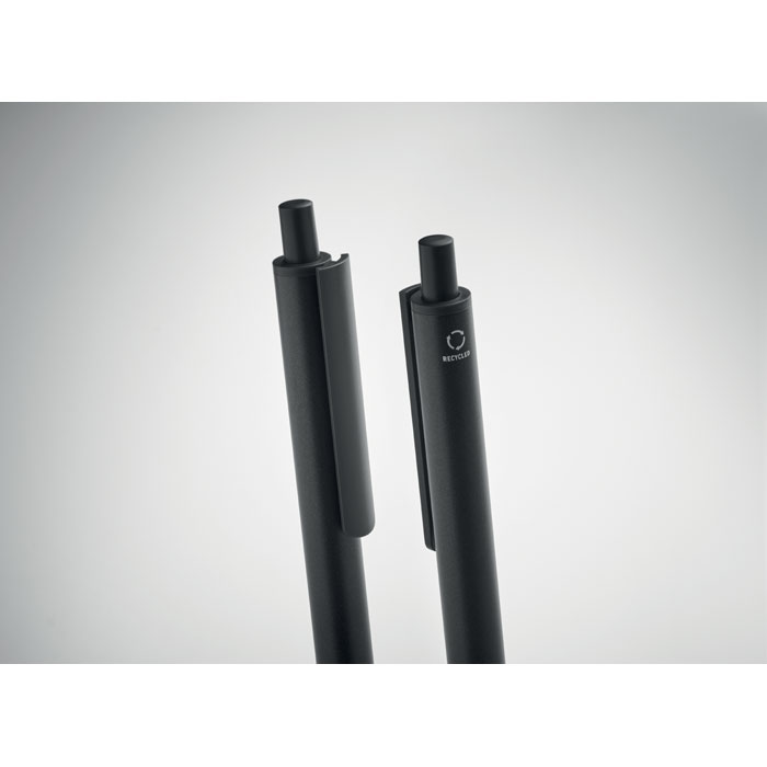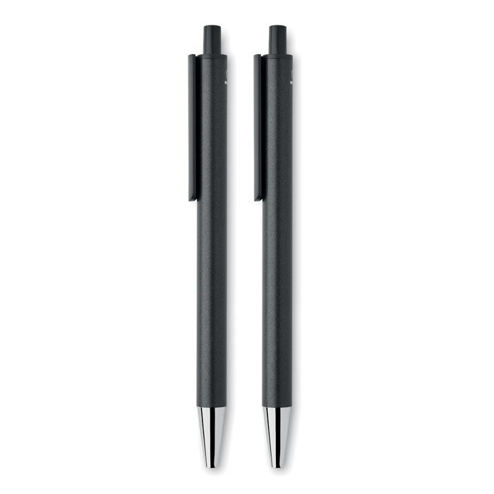 Recycled aluminium pen set with 1 push button ball pen and 1 graphite inkless pen. Blue ink. Presented in recycled paper box.