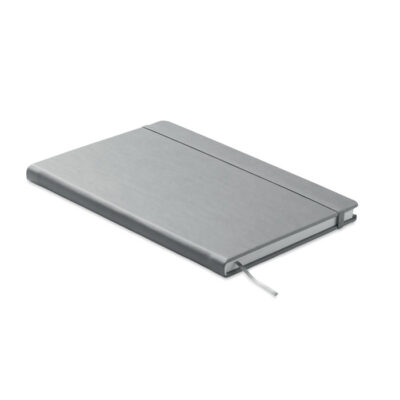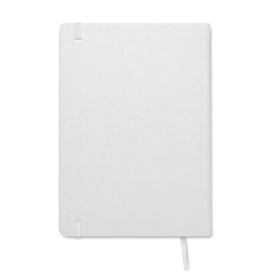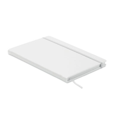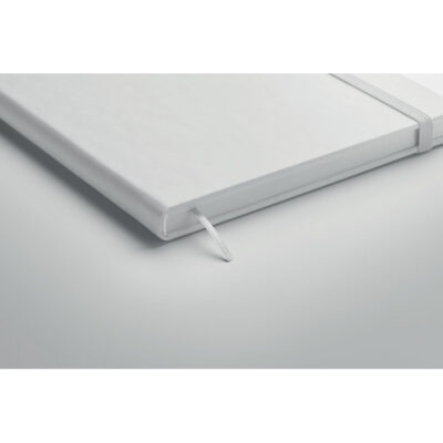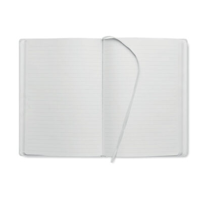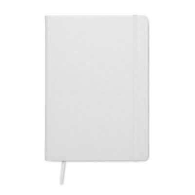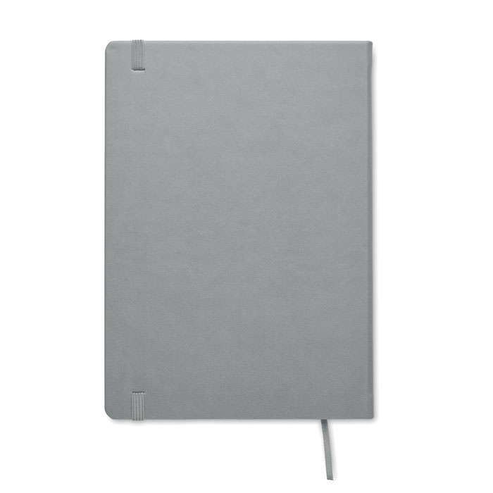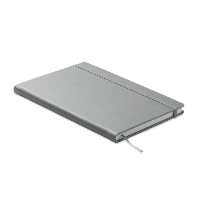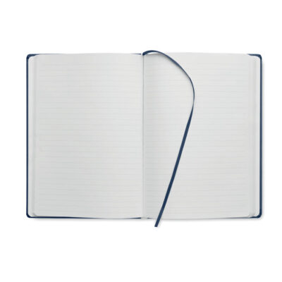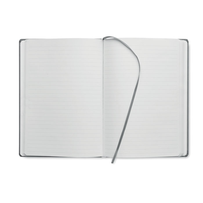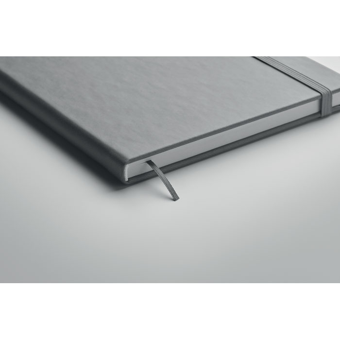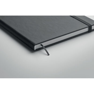 A5 notebook with hard PU cover. Casebound. 200 lined pages (100 sheets) in recycled paper (80 gsm). Matching elastic closure strap and ribbon page-marker. Made in EU.