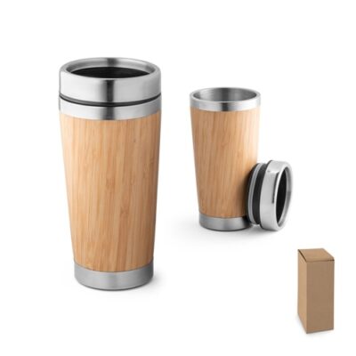 Stainless steel and bamboo travel cup with air-insulated double wall and sliding opening system. Capacity up to 500 mL. Supplied in a kraft paper gift box. As the product is made from natural materials, the colour and the printing result may vary between products. ø82 x 158 mm