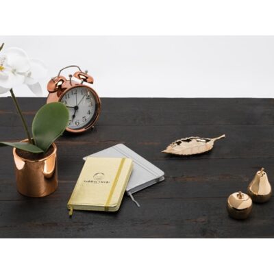 A5 notepad with 160 plain ivory pages, inside pocket, bookmark ribbon, elastic band and metallic hardcover (gold or silver). 137 x 210 mm