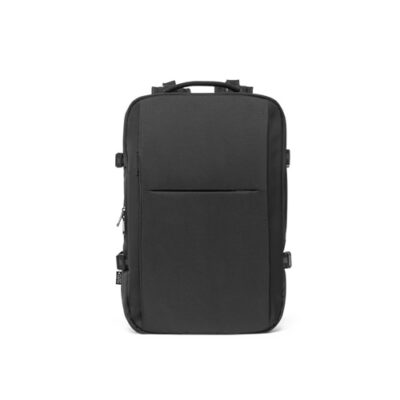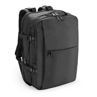“Travel backpack in 600D high-density recycled polyester. It has 3 main compartments with a 210D recycled polyester lining: a rear compartment with a pocket for a laptop up to 173 and a pocket for a tablet up to 101, a central compartment for storing clothes with a fully concealed zipper (when not in use) and a front compartment with PEVA lined. It has 2 front pockets and 1 hidden pocket for carrying your bottle. In addition to these features, it also has other specific features such as: shoulder straps that take the weight off your shoulders, a strap to adjust to your chest, compression straps on the sides, top handles and padded sides. The back incorporates a trolley strap should the need arise. Capacity up to 29 L. Expanded: 320 x 460 x 200mm | Expanded with zipper: 320 x 460 x 110 mm”