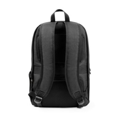 “Laptop backpack in high-density 600D recycled polyester, front in high-density 900D recycled polyester with water-resistant coating and lining in 210D recycled polyester. Main compartment with padded divider for laptops up to 173 and spacious front pocket with several inside pockets. Side pocket ideal for carrying your bottle and back with extra padding and trolley strap. Capacity up to 24 L. 300 x 400 x 180 mm”