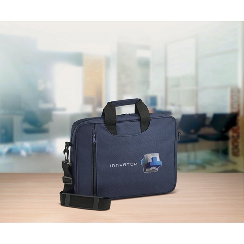 “Laptop bag in 600D polyester with line and padded interior to hold a 156 laptop, 1 main pocket and 2 additional pockets. Adjustable and reinforced shoulder strap 370 x 290 x 60 mm”