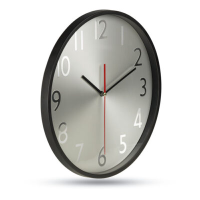 Large wall clock with aluminium dial and hands, protected by a glass lens. 1 AA battery not included.