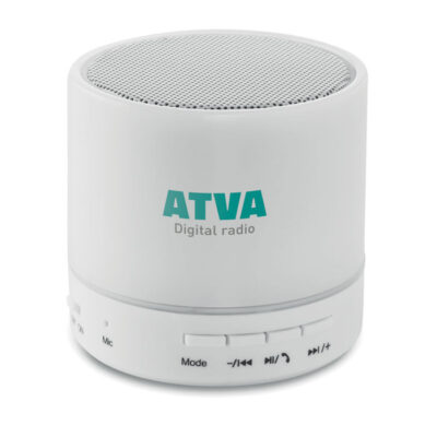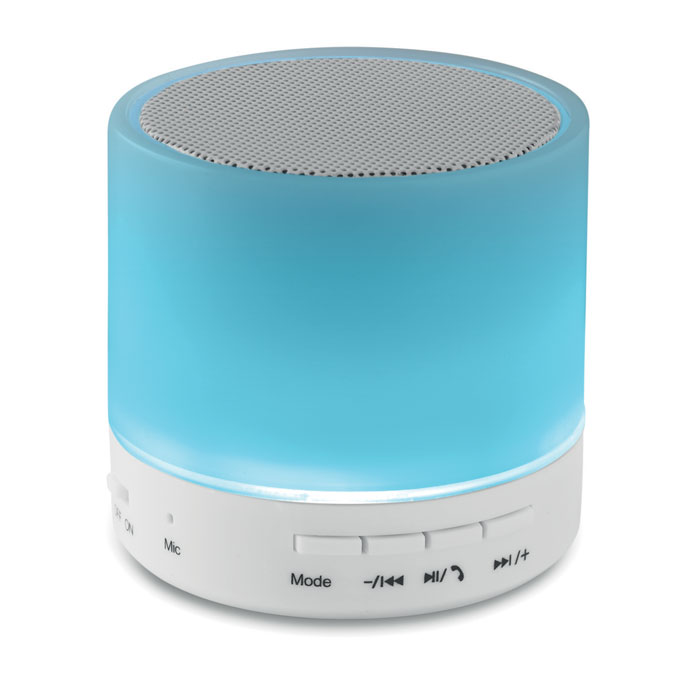 2.1 wireless speaker with LED light indication in ABS. 3 colours changing light. 1 Rechargeable Lithium 450 mAh battery included. Includes a SD card port and an AUX/ USB cable. Hands free call function. Output data: 3W, 4 Ohm. Playing time aprox. 2h.