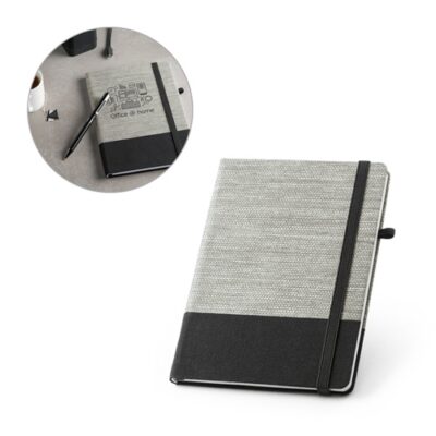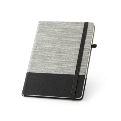 “A5 notepad with hardcover and rounded corners made from natural straw fibres and cotton canvas. This notepad has 192 lined white pages, bookmark ribbon, elastic band and pen holder (pen not included). 150 x 210 mm Promotion valid from 24/09/2024 until 20/12/2024 and limited to existing stock. For more information on the conditions of this promotion, please contact your account manager. “